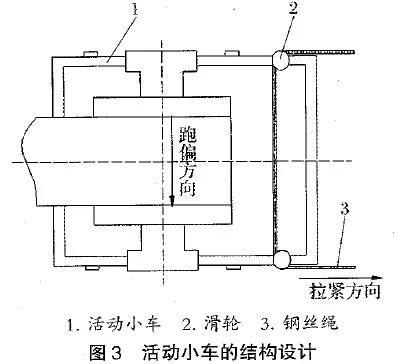 如果是整個(gè)輸送機的中心線(xiàn)發(fā)生偏移,就要重新校正定中心線(xiàn);如果只是輕微的跑偏,可以收緊緊邊的軸承座。但這種方法只能調整較小的偏移量,對于大的偏移量,可以采用將機尾滾筒加裝在活動(dòng)小車(chē)上(見(jiàn)下圖),通過(guò)調整小車(chē)來(lái)糾偏。